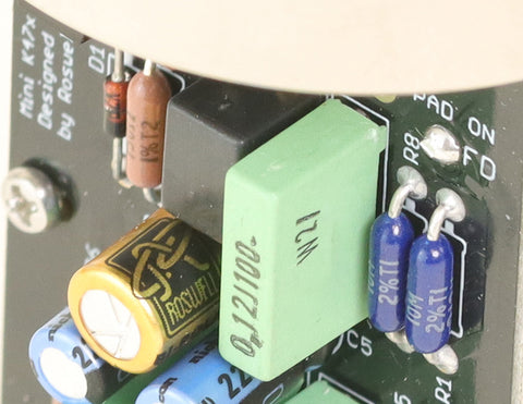 - All the filter capacitors are different formulations. As with the resistors, the K47x parts were chosen for color.