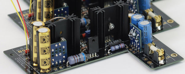 See the PSU internals below. This image shows some of our custom electrolytic filter capacitors, vintage Japanese audiophile resistors, bridge rectifier boards (mounted vertically to aid in convection cooling) with NOS Telefunken diodes, gold-plated German-made fuse and socket, oversized heat sinks on the regulators, etc.