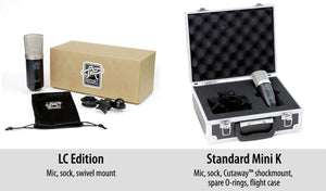 We also offer the "LC Edition," a simpler and smaller package designed to accommodate tighter budgets. The LC Edition mics do not include our Cutaway shockmount or flightcase; they ship in a cardboard carton with a heavy-duty swivel mount.